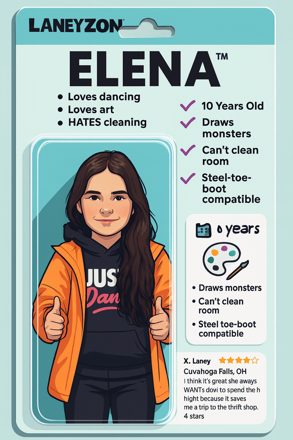 The Elena™ Creative Chaos Edition is optimized for maximum imagination output, continuous artistic creation, nonstop dancing, and absolute refusal to clean her room.